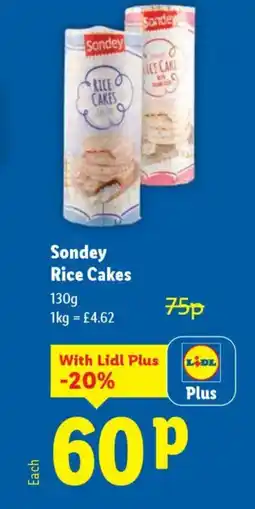 2Lidl Sondey Rice Cakes offerSondey Rice Cakes 130 gLidl£0.75£0.60With Lidl Plus -20%01 January 202607 January 2026 View offer
