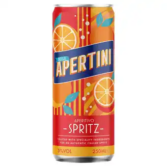 This promotion is available in various stores, view all products to get the cheapest Bella Apertini Aperitivo Spritz 250ml. If you'd like to find out whether this product has a bigger discount in another store, check the category 'Supermarket'. You may also find these offers interesting: Aperol Aperitivo, 1L, offer 2 & offer 3.